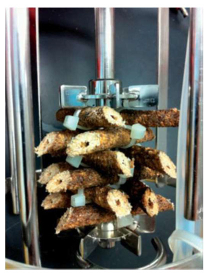 Different Bacillus strains, including B. licheniformis, B. subtilis, and B. amylolquifaciens, were previously investigated for their ability to form mature biofilm structures and MK-7 biosynthesis using glycerol and/or glucose-based media [27,28,29,30,31]. B. subtilis natto emerged as the most promising candidate, producing the maximum concentration of 35.5 mg/L of MK-7. Moreover, four different types of Plastic Composite Support (PCS) compositions were evaluated for hosting B. subtilis natto biofilm formations and maturation [27]. Eventually, the combination of 50% polypropylene, 5% soybean flour, 40% soybean hulls, 5% yeast extract, and minor salts was chosen to fabricate the PCS and construct the biofilm reactors as shown in Figure 1.