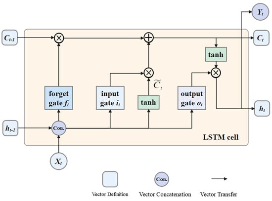 The LSTM model mainly consists of oblivion gates, input gates, cell states, and output gates. Taking the example at time step t, the input at this time can be expressed as , then, the implied state at the previous time step is , and the unit cell state is .