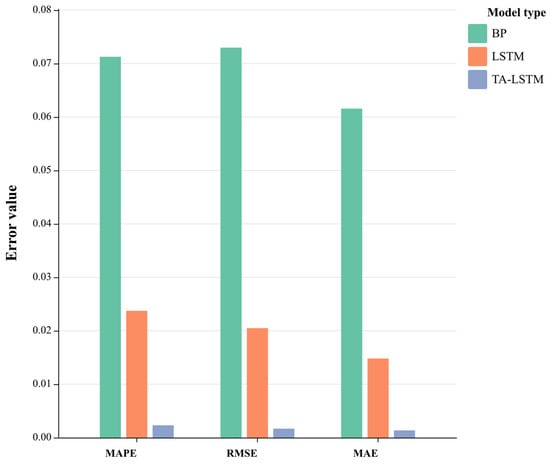 MAPE, MAE, and RMSE are commonly used metrics to evaluate the performance of neural network models [40,41]. To reflect the superiority of the model in one step, this paper adopts the MAPE, MAE, and RMSE evaluation indexes to evaluate the prediction performance of the traditional BP model, the LSTM model, and the TA-LSTM model, respectively, within the traditional BP model, the LSTM model, and the TA-LSTM model. The metrics are shown in Table 3 and Figure 5.