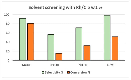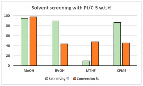 Different solvents were also tested for the reaction in order to scout for greener and safer alternatives to methanol (Figure 1 and Figure 2). Isopropanol (iPrOH), 2-methyltetrahydrofuran (MTHF), and cyclopenthylmethylether (CPME) were thus selected. However, the methanolic solution proved to be the optimal solvent for both catalysts. The second-best result was achieved with CPME both over Pt/C (39.1% yield) and Rh/C (51.3% yield).