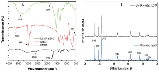 (A) FTIR spectra of pristine DMSA, nZnO, and DMSA-nZnO coated particles; (B) XRD of pristine nZnO and DMSA-nZnO coated.