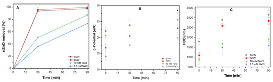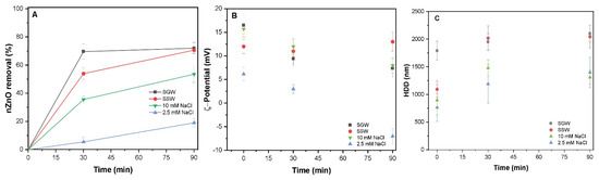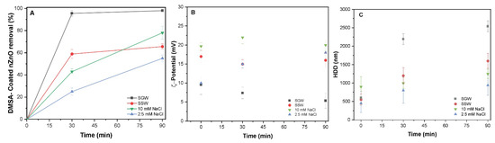 (A) Removal of uncoated nZnO (100 mg/L) in all four studied waters of 2.5 mM NaCl, 10 mM NaCl, 2.5 mM SSW, and 10 mM SGW at PACl (50 mg/L); (B) ζ-potential (mV) and (C) HDD of nZnO in all four waters.