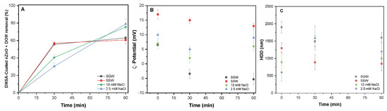 (A) Removal of DMSA-coated nZnO (100 mg/L) + DOM in all four studied waters of 2.5 mM NaCl, 10 mM NaCl, 2.5 mM SSW, and 10 mM SGW at PACl (50 mg/L); (B) ζ-potential (mV) and (C) HDD of nZnO in all four waters.