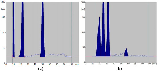 An example of densitograms for mixtures: CIM, DOX, LOR (a) and CIM, CAF, LOR (b) after 56-day incubation at 25 °C.