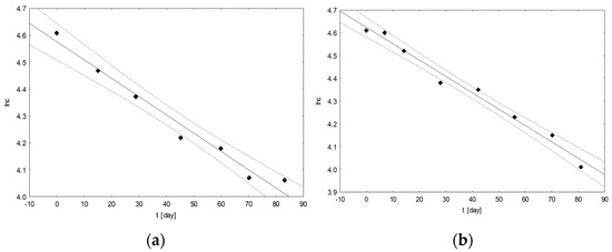 An example of graphs of the ln(c[%]) = f(t[days]) dependence for mixtures of drugs with the following composition: CEL, CAF, ASA (a) and CIM, TRA, KET (b), incubated at 25 °C.