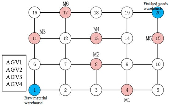 Assuming that there are m sets of machining equipment and w sets of AGVs with the same transport capacity in the flexible machining workshop that need to complete the machining tasks of n different workpieces, the machining task of each workpiece consists of multiple machining processes and the degree of automation of the machining equipment in the workshop is relatively high, and each piece of equipment can also complete a number of different processes for different workpieces so that each process can be completed by a different piece of machining equipment, but the time required to complete the same machining process for different machining equipment is different. Therefore, each process can be completed by different processing equipment, but for different processing equipment to complete the same processing process requires different amounts of time. The layout of the flexible machining workshop is simulated with a topological map as shown in Figure 1.