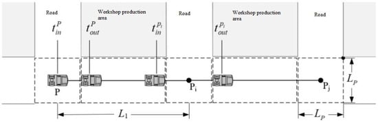 where Ct is the total time for all tasks to be completed, m is the number of AGVs, ti is the time spent by AGVi in the process of completing the task, tpnout is the last node departure time of AGVi in the planning path, tld is the time of loading or unloading goods during one task of the AGVs, Tpush is the time of the task’s issuance, tpiin denotes the time of the AGV’s entry into node pi, and, tpiout denotes the time of AGV’s departure from node pi, and Tbegin denotes the time of AGVs starting traveling after accepting a task. Time, tpiout denotes the time when AGV leaves node pi, Tbegin denotes the time when AGV starts traveling after accepting a task, and the meanings of the rest of the time variables can be deduced by analogy. Lp is the edge length of the node region, Lv is the edge length of the node region, and v is the uniform traveling speed of AGV.