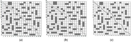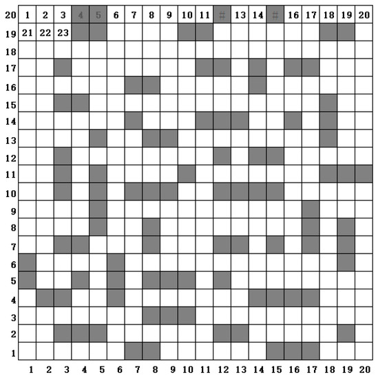 The AGV path planning problem is one of the most frequently encountered problems in the production scheduling process of the job shop. Before solving the path planning problem, it is first necessary to model the job shop layout of the system and choose a suitable map type to simulate the shop layout map. The raster method has simple, efficient and good applicability; this paper uses the raster method to establish the mobile environment of AGVs. Raster maps were proposed by Howden in 1968, by assigning different values to the 2D grid in order to simulate the paths of the shop floor, the 2D positional relationships of the production equipment [26]. The raster map transforms the physical map of the workshop into a grid of equal neighboring areas and assigns values of 1 or 0 to the grids, representing feasible and infeasible areas. The number “1” is used in the coding to represent an obstacle square, which is visualized as a black grid, and the number “0” is used to represent a non-obstacle square, which is visualized as a white grid. Each grid is numbered from bottom to top and left to right. Assuming that the raster map is C rows and N columns, and the length of each raster is a, the position corresponding to the i-th raster is obtained by Equation (5). The position of the coordinates in the raster corresponds to the position of the serial number as shown in Figure 3.