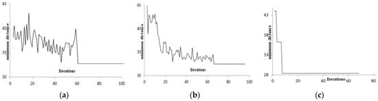 Number of iterations of traditional ACO algorithm, the improved ACO Algorithm with potential field and the algorithm proposed in this paper (20 × 20 maps): (a) Number of iterations of traditional ACO algorithm; (b) Number of iterations of improved Ant Colony Algorithm with potential field; (c) Number of iterations of the algorithm proposed in this paper.