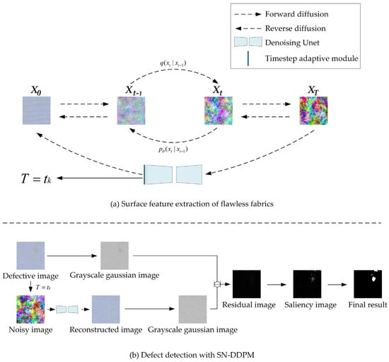 Furthermore, this article proposes a timestep-adaptive-diffusion-model-oriented unsupervised detection method for fabric surface defects. This mainly contributes to the feature extraction of good fabric surface and defect detection with SN-DDPM, as illustrated in Figure 2.
