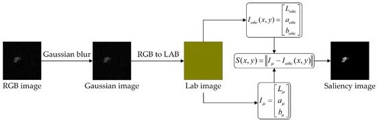 Step 4: The residual image is subjected to FTSD to obtain a saliency image. As demonstrated in Figure 5, the specific process includes smoothing the residual image using a 7 × 7 Gaussian filter to eliminate noise and preserve the overall structure of the image. The image obtained at this time is called a Gaussian image, which is then converted from the RGB color space to the LAB color space to obtain the Lab image. Subsequently, the average pixel values , , and of the L, A, and B channels of the converted Lab image are calculated to obtain the average image feature vector and pixel vector value . After the calculation and normalization of the Euclidean distance of these two vectors, the saliency image is finally obtained.