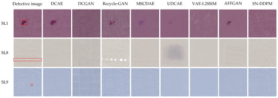 The reconstruction capability of the unsupervised detection model has a direct effect on the detection results, which is primarily reflected in the repair of the defect area of the detected fabric image and that of the image details of the defect-free area. For comparing the reconstruction capabilities of DCAE, DCGAN, Recycle-GAN, MSCDAE, UDCAE, VAE-L2SSIM, AFFGAN, and SN-DDPM, the fabric samples with different textures, background colors, and types of defects were selected in this study. Figure 8 shows the repairing results of eight models on the image to be tested, in which the sample SL1 contains a large defect area. The DCGAN and VAE-L2SSIM exhibit no remarkable defect areas but fail to visualize details of the defect-free areas. The reconstructed image of DCGAN displays obvious stitching traces, while that of VAE-L2SSIM possesses blurring and texture disorder. The DCAE, MSCDAE, AFFGAN, and UDCAE all show traces of defect areas, of which the reconstructed results of MSCDAE are quite different from the original images. Recycle-GAN cannot effectively reconstruct defect areas into good products, and there is a big difference between non-defect areas before and after reconstruction. Compared with the above six models, SN-DDPM shows higher capability to repair defect areas and displays the non-defect areas almost the same as the original images, which is beneficial to the subsequent defect positioning. The second line shows the sample SL8 with monofilament stripe defects and the construction and repair results of each model. After repair by the DCAE, DCGAN, and VAE-L2SSIM, traces of defect areas are not observed, but the texture information of non-defect areas is lost. Furthermore, block stitching traces are visible in the reconstructed images after repair by DCGAN. MSCDAE retains the defects on the reconstruction diagram, and the reconstruction results of non-defect areas are not as good as expected. Additionally, UDCAE is unable to effectively reconstruct the images and Recycle-GAN fails in and enlarges the defect area. In addition, AFFGAN is capable of effectively reconstructing a defect image into a defect-free image but exhibits a too regular and unnatural texture of the reconstructed image compared with the original image. The above comparison and discussion reveal that SN-DDPM possesses leading advantages in repairing defect areas and maintaining relevant details of non-defect areas. The results of eight models in reconstructing and removing small defects in sample SL9 containing small defects are listed in the third row. It can be observed that most models exhibit the repaired defect areas. Nevertheless, VAE-L2SSIM and DCGAN fail to effectively reconstruct the image, while Recycle-GAN and MSCDAE suffer from blurred reconstructed images and defect retention. Therefore, SN-DDPM has a better visual reconstruction effect of texture details than that of other models, thus reasonably demonstrating competitive reconstruction performance.