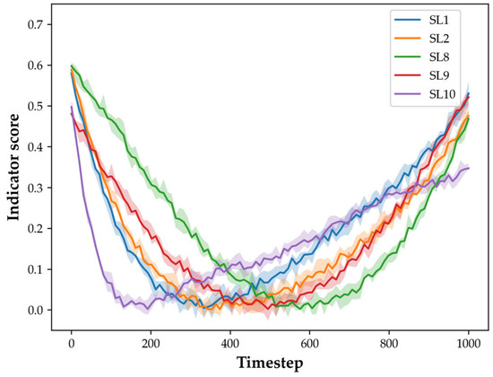 The effectiveness of the timestep adaptive module is based on the condition that the evaluation indicator is a single valley function because it is difficult to solve the optimal timestep in case L is a multi-valley function. The defect-free samples SL1, SL2, SL8, SL9, and SL10 are selected as the experimental subjects to verify whether the evaluation indicator is a single valley function. Specifically, is calculated every 10 steps, with a total timestep of 1000. The experimental results are illustrated in Figure 10.