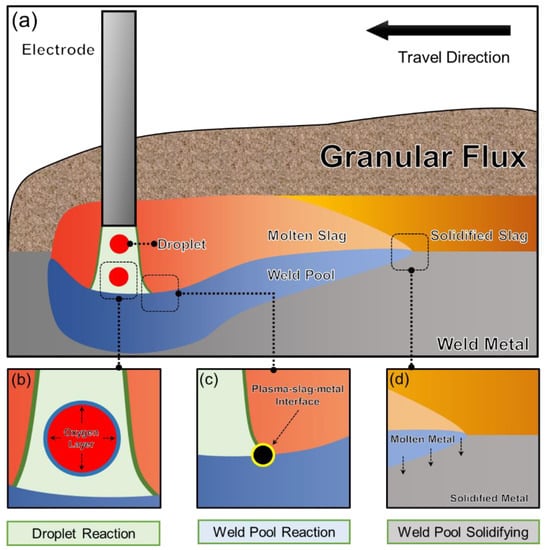 Reaction zones responsible for controlling the O content in the metal during the SAW process [10]: (a) Overall schematic diagram of the SAW process, (b) Droplet reaction zone, (c) Weld pool reaction zone, and (d) Weld pool solidifying zone.