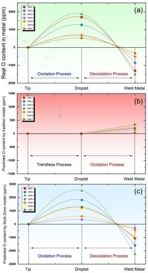 Simulation of O content variation roadmap during the welding process. (a) Real data. (b) Predicted data by equilibrium model. (c) Predicted data by Multi-Zone model.