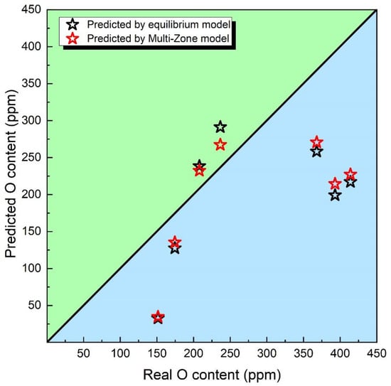 Specifically, Figure 2a presents the actual measured O content values, while Figure 2b portrays the O content values predicted through the conventional thermodynamic equilibrium model. Additionally, Figure 2c displays the anticipated O content values derived from the Multi-Zone model.