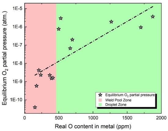 - To predict the O concentration in the droplet, an equilibrium calculation was conducted using iron (Fe) and O as the input metal constituents. The PO2 value provided in Table 3 was employed for this calculation. Table 3 presents the concentration of Oin molten droplets and the corresponding partial pressure of O2 in equilibrium.