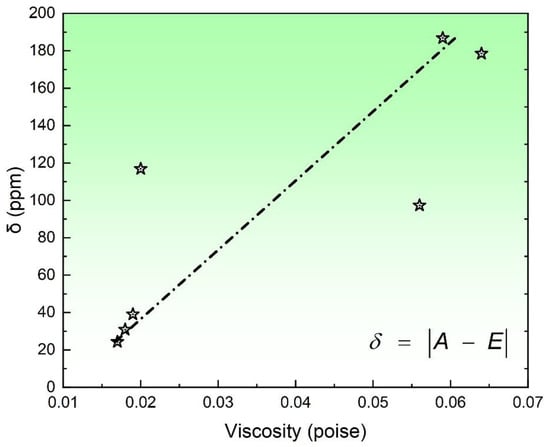 In general, the viscosity of the flux plays a crucial role in determining the extent of chemical reactions. Although the precise reaction mechanism of SAW remains unclear, it is widely believed that increasing the flux viscosity leads to a greater deviation between the actual observed values and the thermodynamic equilibrium point. To verify such a scientific hypothesis, the relationship between δ and the viscosity of the flux (slag) was depicted in Figure 5.