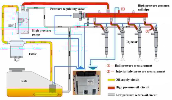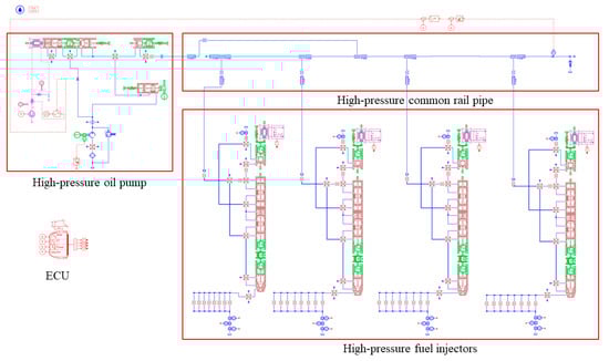 As a complex nonlinear system under multi-physical couplings, the HPCRIS contains many physical fields, such as mechanical, mechanical and electromagnetic fields. The internal flow field characteristics of the system cannot be completely obtained by a single test or piece of research, but the establishment of a numerical simulation model can effectively observe the changes in the internal flow field of the HPCRIS. The HPCRIS [19,20,21,22] mainly includes a high-pressure oil pump, common rail pipe, fuel injectors, electronic control unit ECU and other components. The framework is shown in Figure 1.