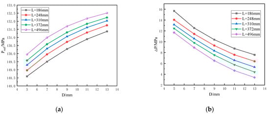 As shown in the Figure 16a contour plane, the maximum rail pressure fluctuations occur at the position where D is smaller and L is smaller, and the density of the contour line distribution in the D direction is much greater than that in the L direction, indicating that D has a greater influence on rail pressure fluctuations than L. According to Figure 16b, as L and D increase, the rail pressure fluctuations inside the common rail pipe show a downward trend. Moreover, the decrease in rail pressure in the D direction is much greater than the decrease in rail pressure in the L direction, which further verifies that the influence weight of D on the rail pressure fluctuations is greater than that of L.