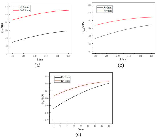 The influence of the interaction factor between L and D parameters on the average rail pressure Prail is shown in Figure 11a; when 186 mm < L < 496 mm, the average rail pressure of the common rail pipe increases with the increase in L. The analysis of the interaction factor between L and R on the average rail pressure is shown in Figure 11b; when R is fixed, the average rail pressure increases with the increase in L, and an appropriate increase in R can be conducive to increasing the average rail pressure. The analysis of the interaction factor between D and R on the average rail pressure is shown in Figure 11c. When D is a constant value, increasing R is beneficial to increasing the average rail pressure. As R increases, the average rail pressure eventually tends to stabilize to an equal value. According to the overall analysis in Figure 11, it can be seen that as L, D, and R increase, the slope of the average rail pressure increase gradually decreases, and the rail pressure increase gradually stabilizes.