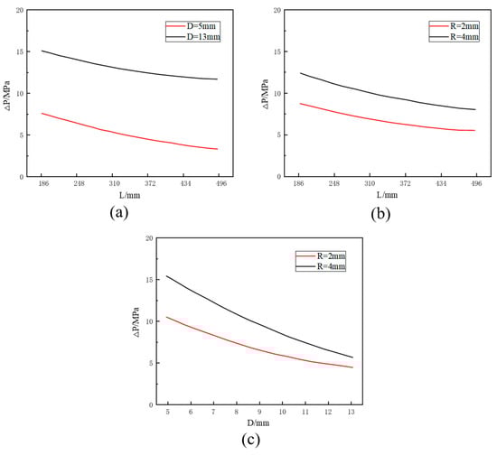 The interactive effect of parameter factors L and D on the average rail pressure fluctuations ΔP is shown in Figure 12a. When D remains constant, the average rail pressure fluctuation decreases with the increase in L. An appropriate increase in L can effectively suppress the rail pressure fluctuations, but when L is large, the rate of decline in rail pressure fluctuations gradually tends to flatten. The interactive effect of the L and D parameter factors on the average rail pressure fluctuations ΔP is shown in Figure 12b. When 186 mm < L < 496 mm, the rail pressure fluctuations gradually decrease with the increase in R. An appropriate increase in L is beneficial o effectively suppressing the rail pressure fluctuations. The interactive effect of the D and R parameter factors on the average rail pressure fluctuations ΔP is shown in Figure 12c. When R is a fixed value, the rate of rail pressure fluctuation decreases with the increase in D is greater than the rate of rail pressure fluctuation decreases under the influence of L and R parameters, indicating that D has the most significant impact on the rail pressure fluctuations.