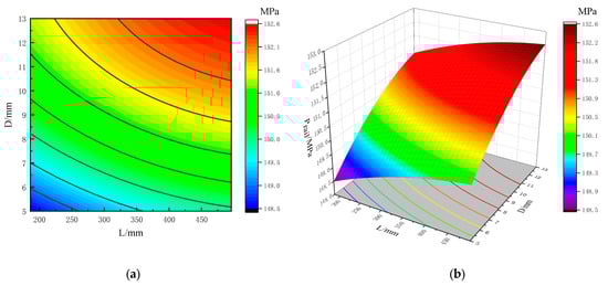 In Figure 13a contour plane, it can be concluded that the contours of L and D have obvious changes, and the density of the contour distribution of D is greater than that of L, indicating that the influence of D on the average rail pressure is greater than that of L. As shown in Figure 13b, L and D have a significant impact on the average rail pressure of the common rail pipe. The larger values of the average rail pressure are distributed in the upper right area of the response surface, which is the area with a larger L and D.
