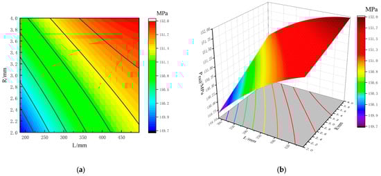 As shown in Figure 14a contour plane, the density of the contour distribution of L is greater than that of R, indicating that the influence of L on the average rail pressure is greater than that of R. As shown in Figure 14b, there is a significant change in the inclination of the surface in the direction of the L change, while the inclination of the surface in the direction of R change is relatively small, meaning that L has a greater impact on the average rail pressure and R has a smaller impact on the average rail pressure value. The maximum rail pressure is distributed in the areas with a larger L and R, which are on the upper right side of the surface.