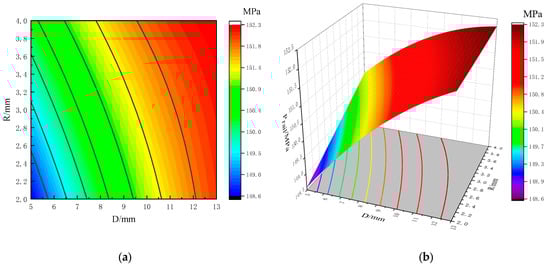 As shown in Figure 18a contour plane, the density of the contour line in the D direction is much greater than the density of the contour line in the R direction. This is because the change in the size of D has a greater impact on the volume of the HPCRIS, indicating that D has a much greater impact on rail pressure fluctuations than R. As shown in Figure 18b, it can be seen that the surface in the D direction descends faster, further proving that D has a more significant impact on rail pressure fluctuations. The rail pressure fluctuations decrease with the increase in D and R, and the minimum value of rail pressure fluctuations is distributed at the lower left side of the curved surface.