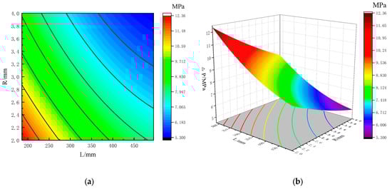 As shown in Figure 17a contour plane, the density of the contour line in the L direction is greater than that of the contour line in the R direction, indicating that L has a greater influence on rail pressure fluctuations than R. As shown in Figure 17b, the minimum value of rail pressure fluctuations is located at the positions with a larger L and R, which is the lower left side of the response surface. The rail pressure fluctuation range in the L direction is about 5 MPa, and the rail pressure fluctuation range in the R direction is about 2 MPa.