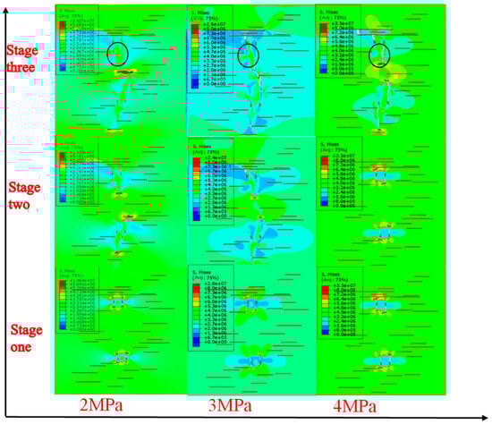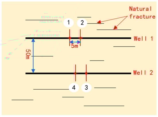 It can be seen from Figure 4 that different in situ stress differences affect the fracture propagation morphology when the hydraulic fracture meets between wells and the fracture morphology when the hydraulic fracture intersects with the natural fracture. When the stress difference is small, under the effect of stress concentration, the hydraulic fractures between wells do not easily connect when they meet. When the in situ stress difference is large, the hydraulic fractures meet and converge into one fracture. When the stress difference is 2 MPa, the hydraulic fracture is more likely to be captured by the natural fracture in the process of fracture propagation when it meets the natural fracture. When the stress difference is 4 MPa, the hydraulic fracture is more likely to pass through the natural fracture and form a simple vertical fracture. Usually, when the stress difference is low, the natural cracks can become more connected, complex natural cracks can form, and the transformation area is larger, which is preferred. When the stress difference of the reservoir is high, the stimulation effect of fracturing is poor, and it is not easy to exploit oil and gas.