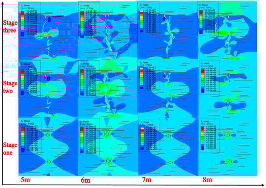 It can be seen from Figure 11 that the hydraulic fractures’ morphology in both wells is different for the two fracturing sequences. In simultaneous fracturing, the hydraulic fractures propagate simultaneously with less inter−well interference and are affected only in the later stage of hydraulic fracture propagation. In sequential fracturing, there is more inter−well interference, the formation of hydraulic fractures in one well causes stress changes near well 2, and the effect of stress concentration near the hydraulic fractures greatly inhibits the propagation of hydraulic fractures in well 2.