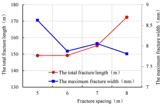 As shown in Figure 6 and Figure 7, under the combined effect of hydraulic fractures and natural fractures, the spacing between fractures has a significant impact on the morphology of fractures. As the spacing between fractures increases, the number of natural fractures connected by fractures increases, indicating that a small spacing between fractures can suppress the formation of complex fractures. The total length of fracture propagation increases by 15.59% because when the spacing between fractures is small, the stress shadow between multiple fractures is large, which limits the propagation of fractures. The maximum width of fractures decreases with the increase in the spacing between fractures, but the variation in fracture width fluctuates. This is because the propagation of fractures is influenced by the competition between hydraulic fractures, and on the other hand, when there are more natural fractures connected, leakage can occur and affect the propagation width of fractures. Therefore, for different reservoirs, optimizing the spacing of hydraulic fracturing in the fracturing design can increase the length of fracture propagation and form a complex fracture network.