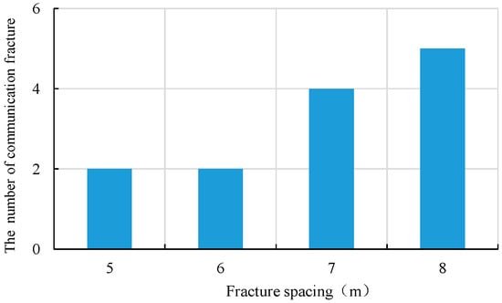 We plotted the comparison curves of the number of natural fractures connected by hydraulic fractures and the total length of fractures under different fracture spacings, as shown in Figure 6 and Figure 7, respectively.