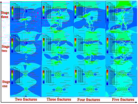 The number of hydraulic fractures has a significant influence on fracture propagation due to the interference between the fractures. The influence of fracture number on the fracture morphology was analyzed by studying the hydraulic fracture propagation models with two, three, four, and five fractures. The fracture propagation results are shown in Figure 8.