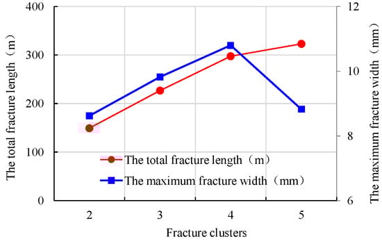 From Figure 9 and Figure 10, it can be seen that under the combined action of hydraulic and natural fractures, increasing the number of hydraulic fracture clusters has an important influence on fracture morphology. With the increase in the number of fracture clusters, the total length of the fractures increases from 149.15 m to 323.16 m, with a growth rate of 116.67%, which is a significant increase. At the same time, the maximum width of the fractures increases by up to 25.23%, but this change is not linear. This is due to the complex competition between hydraulic and natural fractures. The number of fractures communicating with natural fractures increases from two to nine, which significantly increases the complexity of the fracture network, and the direction of fracture propagation also increases, leading to an increase in the reservoir control area. Therefore, the number of hydraulic fracture clusters plays a very important role in the propagation morphology and complexity of the fractures.