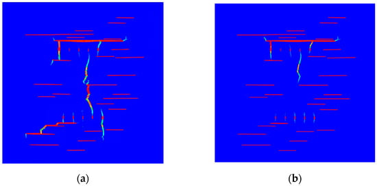 It can be seen from Figure 8 that the hydraulic fractures exhibit an asymmetric and complex fracture pattern, intersecting and converging with natural fractures to form fractures with different directions. With the increase in fracture number, the fracture morphology propagation becomes more complex, and the volume of fracturing reconstruction increases. When there are two hydraulic fracturing fractures, the fracture morphology is singular, and the fractures converge into one main fracture. When there are multiple hydraulic fracturing fractures, under the disturbance of multiple fractures, the hydraulic fractures propagate in more directions, forming multiple multi−direction fracture morphologies.