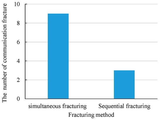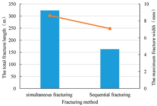 In order to further analyze the fracture growth morphology under different fracturing methods, the comparison curves of the number of hydraulic fractures communicating with natural fractures, the total length of fractures, and the maximum width of fractures under different fracture spacings are plotted and shown in Figure 12 and Figure 13.