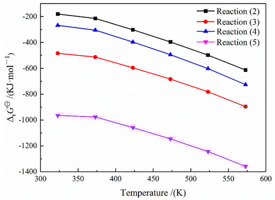 In the above reactions, the of SDSPs at different temperatures were estimated using an approximate algorithm for the Gibbs free energy of complex silicate minerals introduced in reference [29], combined with thermodynamic data of simplified compounds and ionic components obtained from references [30,31,32]. The calculations were conducted using classical thermodynamic algorithms. Consequently, the relationship between the of reactions (2) to (5) and different temperatures was determined, as shown in Figure 2.