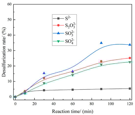 As shown in Figure 3, the desulfurization rate of kaolinite increased with prolonging reaction time at 100 °C in different sulfur-bearing sodium aluminate solutions. In the -bearing sodium aluminate solution, desulfurization rate of kaolinite was about 3.5% in 10 min, and reached approximately 5.3% with a gradual increase in 120 min. By contrast, the desulfurization rate of kaolinite increased significantly for , and as the reaction time prolonged. Additionally, the highest desulfurization rate of kaolinite reached approximately 34% after a reaction time of 120 min in -bearing sodium aluminate solution. As for and , the desulfurization rates of kaolinite were both around 20% in 120 min. The results indicate that kaolinite exhibited a certain degree of desulfurization under the pre-desilication reaction conditions; however, the achieved highest desulfurization rate was only about 30% during the removal reaction.