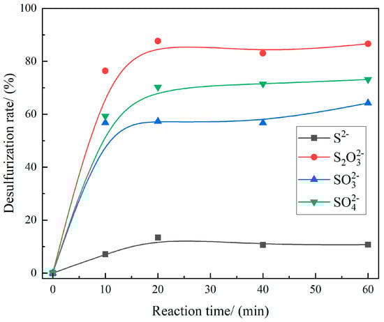 To improve the desulfurization efficiency of kaolinite, the desulfurization reactions were conducted at 260 °C, namely the conventional diaspore digestion temperature (as depicted in Figure 4). In Figure 4, with the increase in reaction time, a significant increase in desulfurization rates of kaolinite can be clearly observed after reacting with sodium aluminate solution containing , , and at 260 °C. During the initial 10 min of the reactions, the desulfurization rates of kaolinite increased obviously, while the reaction time extended to 20 min, and the desulfurization rates grew slowly. The obtained desulfurization rates of kaolinite were approximately 13.3%, 87.6%, 57.3% and 70.2% for removing , , and , respectively. Further prolonging the reaction time to 60 min, the desulfurization rate remained stable, and no significant changes were observed.