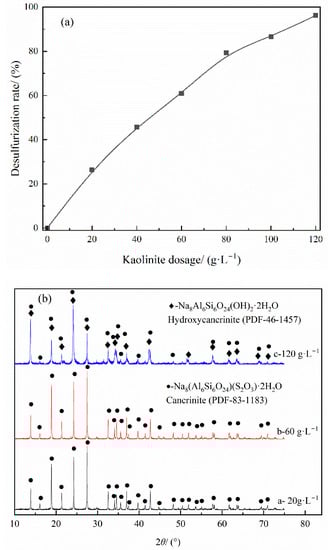 The aforementioned analysis revealed that kaolinite removed approximately 90% of during the digestion process at elevated temperature in sodium aluminate solution. Consequently, subsequent investigations focused on exploring the reaction between kaolinite and -bearing sodium aluminate solution. The effects of kaolinite dosage on desulfurization efficiency and phase composition of SDSPs are illustrated in Figure 5.