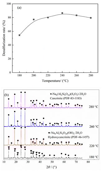The reaction temperature has a significant influence on the desulfurization process of kaolinite in sodium aluminate solution. The desulfurization efficiency of kaolinite after reacting with –bearing sodium aluminate solution was investigated within the temperature range of 180~280 °C, as shown in Figure 6.