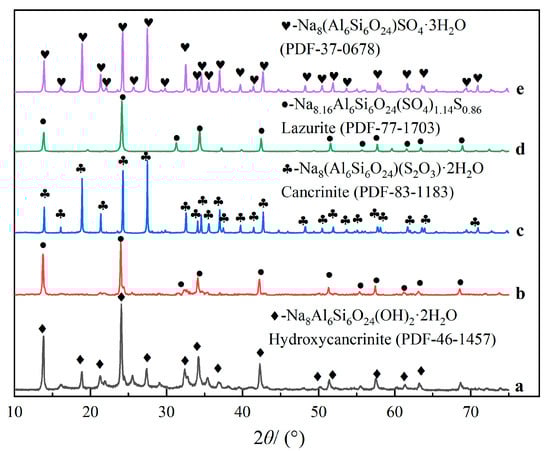 The XRD patterns of the residues obtained after kaolinite reacting with sodium aluminate solution (a) and sulfur-bearing sodium aluminate solution (b–e). (ρ(Na2O): 230.29 ; αk: 2.98; 260 °C, 1 h; dosage: kaolinite 100, b-Na2S·9H2O 37.50 , c-Na2S2O3·5H2O 19.40 , d-Na2SO3 19.68 , e-Na2SO4 22.18 ).