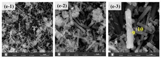 The micromorphology and micro area composition of DSPs obtained in different reaction conditions were further detected through SEM and EDS analyses. The SEM results are presented in Figure 8, and the composition analysis results of selected sites (1#–10#) using SEM-EDS in Figure 8 are listed in Table 1.