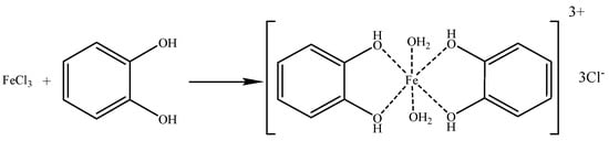 A certain mass of catechol was dissolved in ethanol, and an iron chloride aqueous solution was prepared according to the molar ratio of iron chloride to catechol of 1:2. The iron chloride aqueous solution was slowly dropped into catechol ethanol solution, mixed evenly, stirred at 70 °C for 4 h, and dried to obtain a catechol iron (C−Fe) catalyst. The preparation of C−Fe is shown in Figure 2.