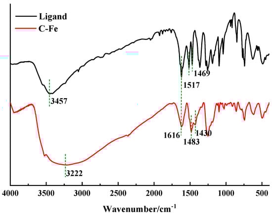 Figure 3 displays the infrared spectra of the catalyst and ligand. The absorption peaks of the ligand at 1616 cm−1, 1517 cm−1, and 1469 cm−1 are the absorption peaks of the benzene ring. The corresponding absorption peaks at 1616 cm−1, 1483 cm−1, and 1430 cm−1 in the catalyst are also the absorption peaks of the benzene ring. The stretching vibration peak of −OH in the ligand catechol is around 3457 cm−1, and the peak is strong and sharp. After the association with the iron ion is completed, where the stretching vibration peak position of the hydroxyl group is at 3222 cm−1, and the peak width is strong, the infrared absorption position shifts. It shows that the −OH of the ligand coordinated with metal ions, and the ligand formed a stable complex.
