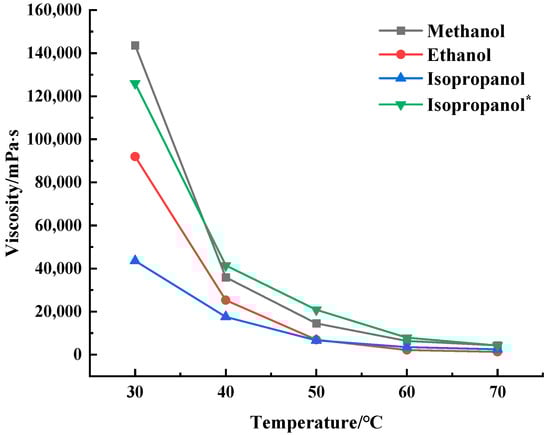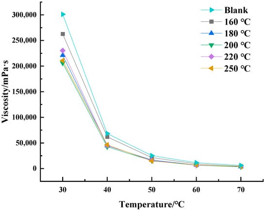 We aimed to investigate the viscosity–temperature properties of the oil samples after a hydrothermal cracking reaction at different reaction temperatures. As shown in Figure 4, the oil samples already had a good viscosity reduction effect at low temperature, and the higher the temperature, the better the viscosity reduction effect. The viscosity reduction rate of the oil samples reached its maximum at 200 °C. Due to the increase in temperature, the energy given to the system became larger, which caused the chemical bonds of the recombinant components in the oil samples to break, resulting in a viscosity decrease. When the temperature was too high, the hydrothermal cracking reaction polymerization reaction dominated, and coking occurred at the bottom of the reactor. Therefore, 200 °C was selected as the optimum reaction temperature.