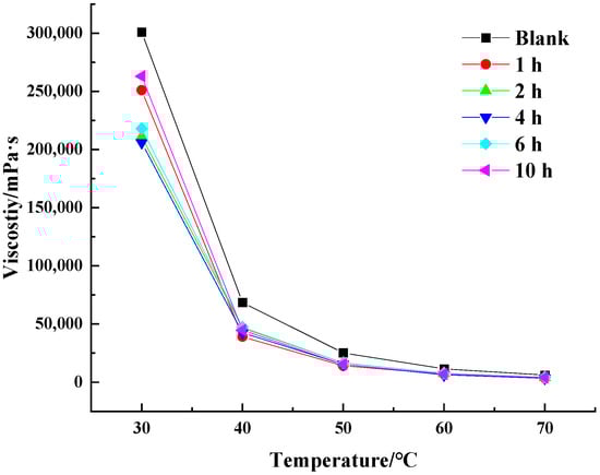 After determining the reaction temperature at which the oil samples were subjected to a hydrothermal cracking reaction, we continued to examine the effect of different reaction times on the viscosity–temperature properties of the oil samples after hydrothermal cracking. As shown in Figure 5, the viscosity of the oil samples decreased with increasing reaction time, and the hydrothermal cracking reaction had the best viscosity-reducing effect on the oil samples when it reached 4 h. The viscosity of the oil samples gradually recovered as the reaction time increased, which indicated that the hydrothermal cracking reaction was essentially completed at 4 h. Therefore, the reaction duration was determined to be 4 h.