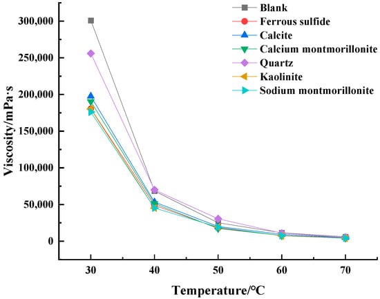 Six minerals were selected to carry out the aquathermolysis reaction under the reaction conditions determined above. As evidenced by the analysis in Figure 7, clay minerals typically have a distinct catalytic reduction effect. Strong adsorption, cation exchange capacity (CEC), and strong acid centers of the clay may be responsible for this phenomenon. The viscosity comparison performed at 30 °C demonstrated that sodium montmorillonite exhibited the most significant reduction in viscosity, reaching up to 41.53%. This was followed by kaolin, showing a viscosity reduction rate of 40.10%, and ferrous sulfide, with a viscosity reduction rate of 40.00%. The findings indicate that minerals exhibit a notable influence on aquathermolysis.